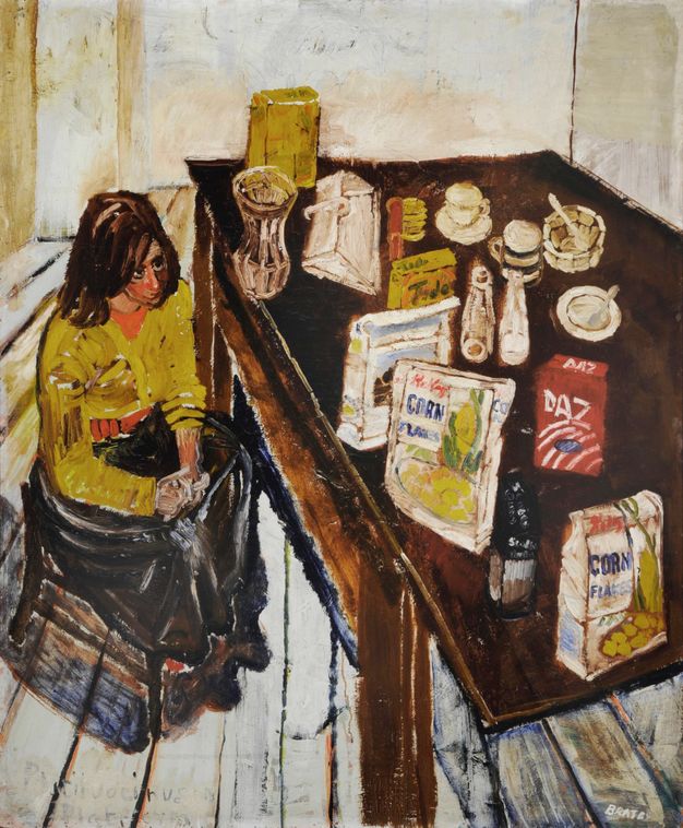 2In what can be considered a classic “kitchen sink” painting because of its mundane breakfast setting, in Jean and Table Top (Girl in a Yellow Jumper), John Bratby depicts his new wife gazing blankly across their kitchen (fig. 1). With hands clasped at her lap and head tilted, Jean appears small next to the cluttered table of cereal boxes, washing powder, dirty bowls, empty teacups, and glass milk bottles left over from breakfast. The scene does not suggest Jean’s domestic bliss, but bears witness to her disengaged affect in this everyday reality.